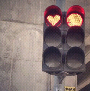 驾车的,通常在遇到红灯时,总是有那么的一点点不耐烦。是不是?如果有一天在交通灯前停了下来,抬头一看,看到这样的红灯,是不是会会心一笑?